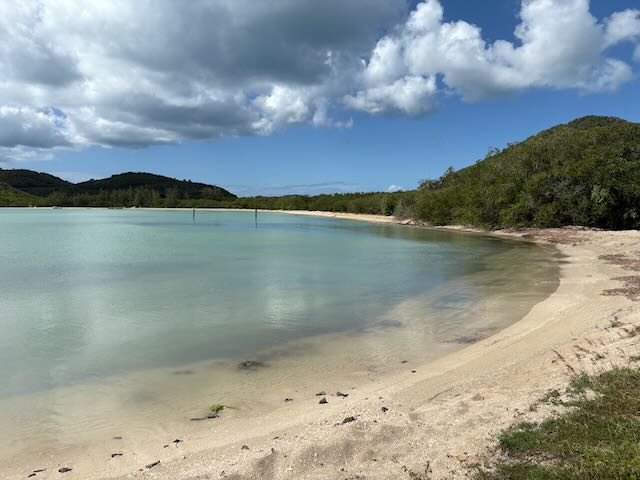 Next we carry on towards Mosquito Bay and check out all the canal condos. Looks like many monohulls pulled up to some of the condos. Mosquito Bay beach looks very nice but not a soul on it. Maybe there are too many mosquitos. We’re just trying to knock off some of the 365 beaches, this is #4.