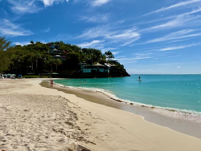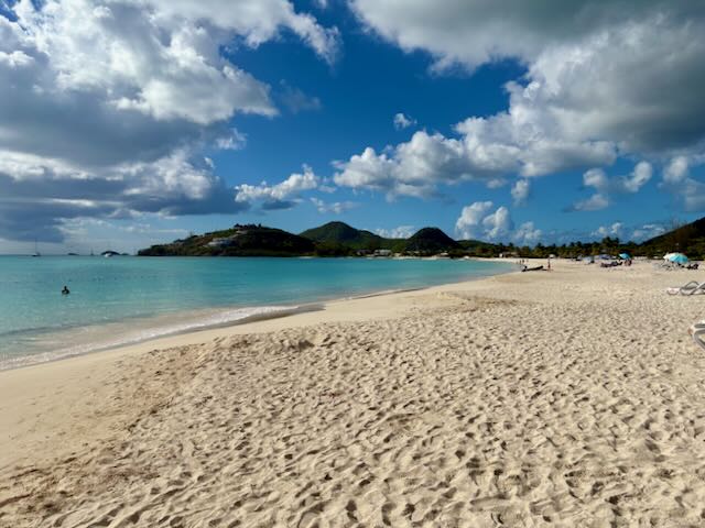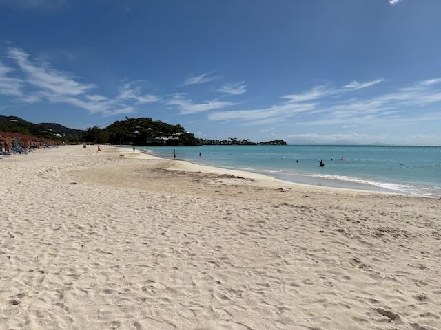 We drive back around and go to Jolly Beach. THIS is a beach. It’s huge, almost the entire south end is occupied by the massive Jolly Harbour Resort. Looks like a 3.5-star all-inclusive. Would be fun I suppose. At the south end of the beach is a much smaller, mush posher place, can’t even visit the bar if you’re not a guest. We walk back towards the north end and jump in the ocean to cool off.