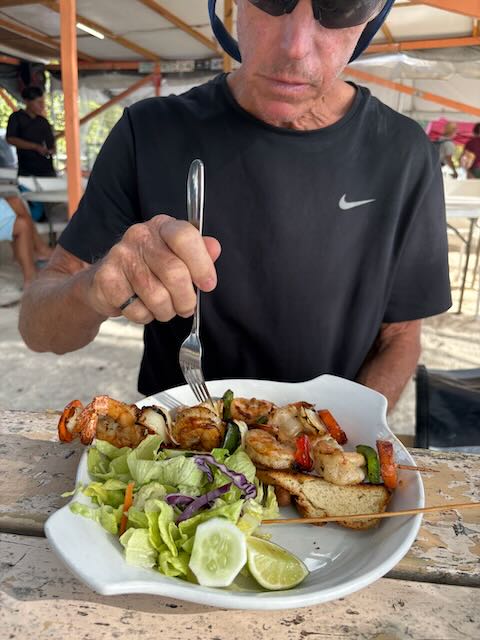 Near where the golf cart is parked there is a little open air restaurant, quite a few people there so we decide to check it out. (None of the other places seemed to take walk-ins or were not appealing enough.) Takes a long time to get served but we have two excellent shrimp kebabs and a soda each. They actually give us ice, a lime and a straw in a glass! Usually, when you order soda you just get the can. Pretty reasonable price too. We give her a nice tip.