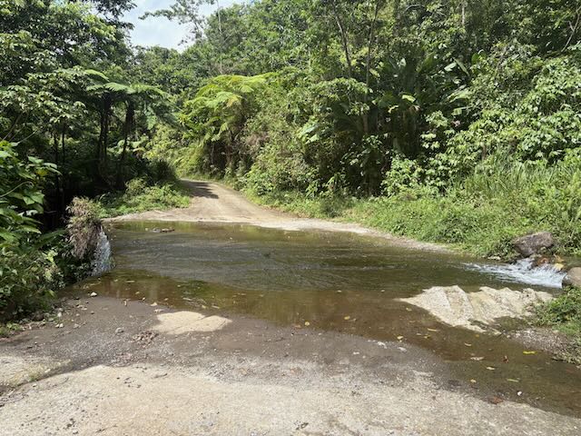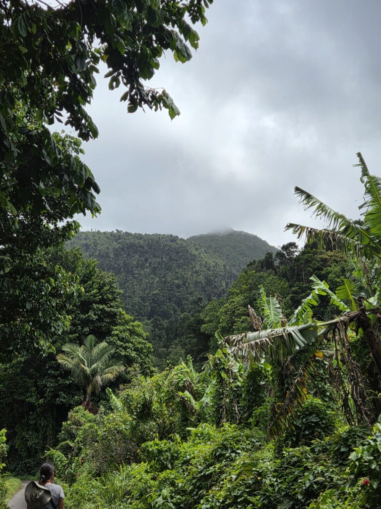 We’ve decided to pull up on the PAYS beach and tie to a tree. As we’re loading up I get the idea to take a PAYS taxi in that way we don’t have to worry about the dinghy. We call in on VHF 16 and soon enough they send a taxi. From there we negotiate EC$200 for a taxi to the start of the trail which is up the Syndicate Road. In hindsight this is exorbitant. We could have rented a car for the day for US$63. But so be it.