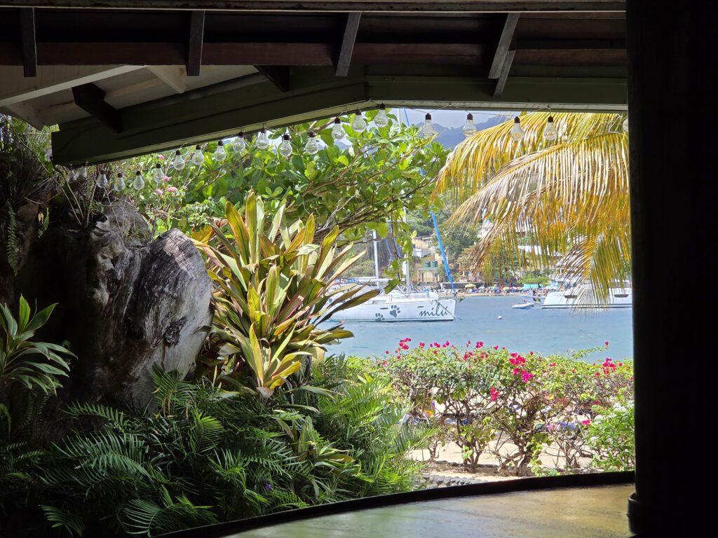Around 1 pm we’re done and both dirty. Swim and clean off in the clear waters of Young’s Cut. Then we dinghy over to Young Island Resort, literally a rock throw from the boat. We snoop around a bit and have a cold drink at the bar. The bartender is indifferent but it’s a nice enough place. I notice that on April 1st next week the daily price goes from US$696 to US$484.